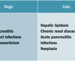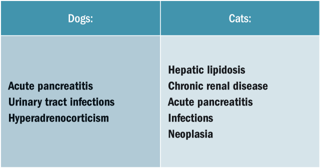This process most commonly develops in undiagnosed or newly diagnosed diabetics that are not receiving adequate insulin. However, all diabetic patients are at risk, especially if they have or develop comorbidities. The vast majority of patients with DKA (reportedly 70% of dogs and 90% of cats) have a concurrent disease process (Cooper et al, 2015; Hume et al, 2006). This leads to an increase in ‘stress’ hormones (eg. glucagon and cortisol) which counteract the effects of insulin and results in further ketone production. Identifying an underlying ‘trigger’ for the development of DKA is therefore a vital part of the diagnostic plan. Figure 2 gives some of the most common concurrent diseases seen in DKA patients.