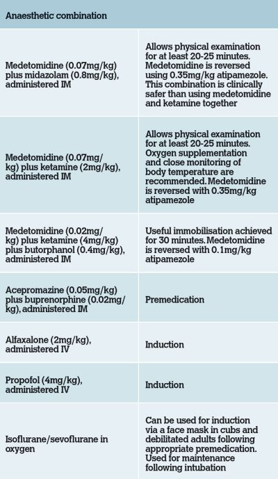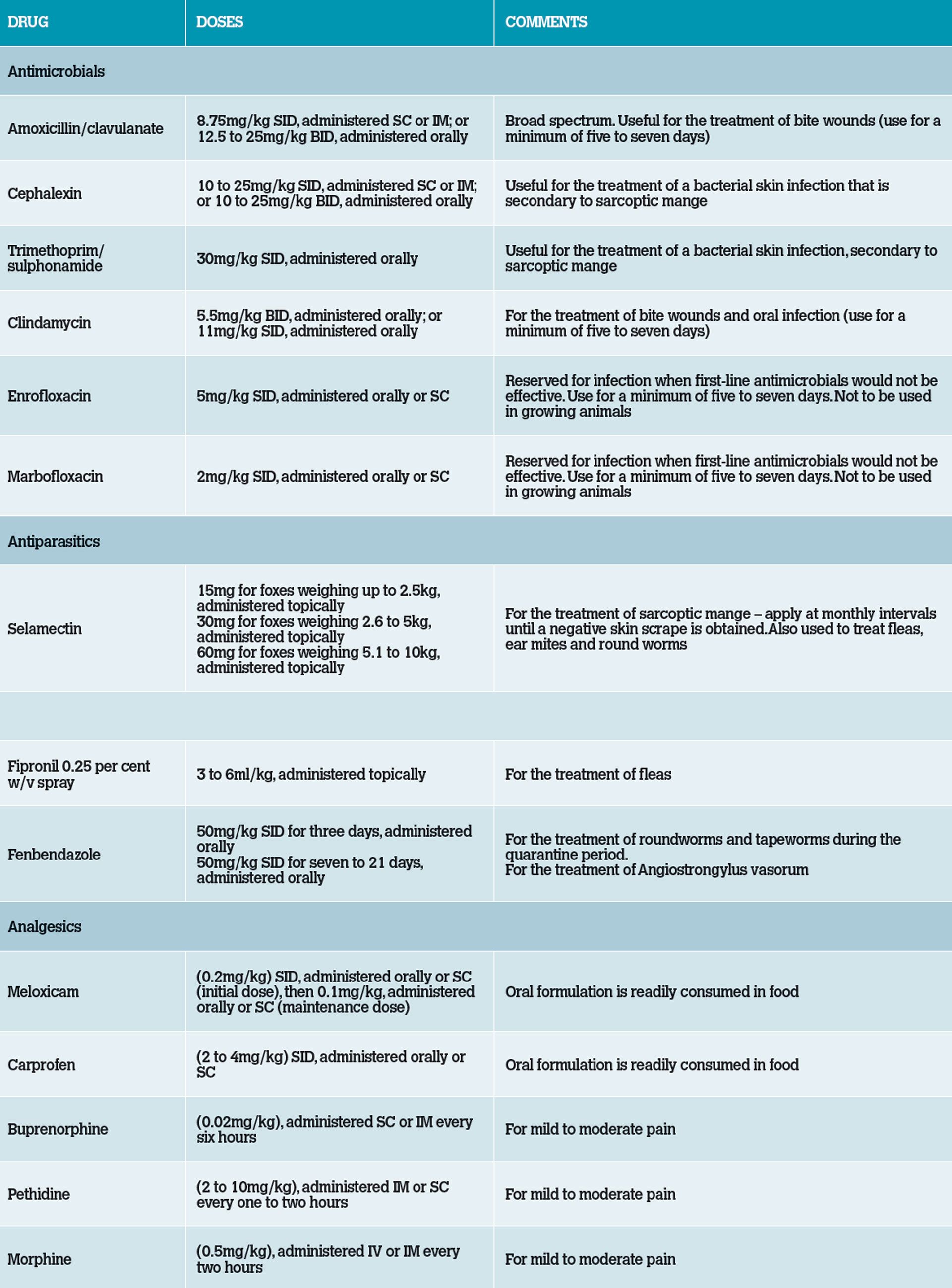 Blood sampling is best done via the jugular or cephalic veins, and can be done in a conscious animal if well restrained. Indications for routine bloodwork are similar to those of domestic dogs. Radiography is used in the case of potential fractures to assess the extent of injury and the potential for successful repair. Ultrasonography can be employed, but extensive areas should not be clipped as this can significantly impact thermoregulation, especially in the winter months. Faecal parasitology can provide a good insight into the overall endoparasite burden of the individual, while skin scrapes can be used to confirm a diagnosis of sarcoptic mange. It is important not to confuse hair loss in lactating vixens and naturally moulting individuals with that associated with mange.1