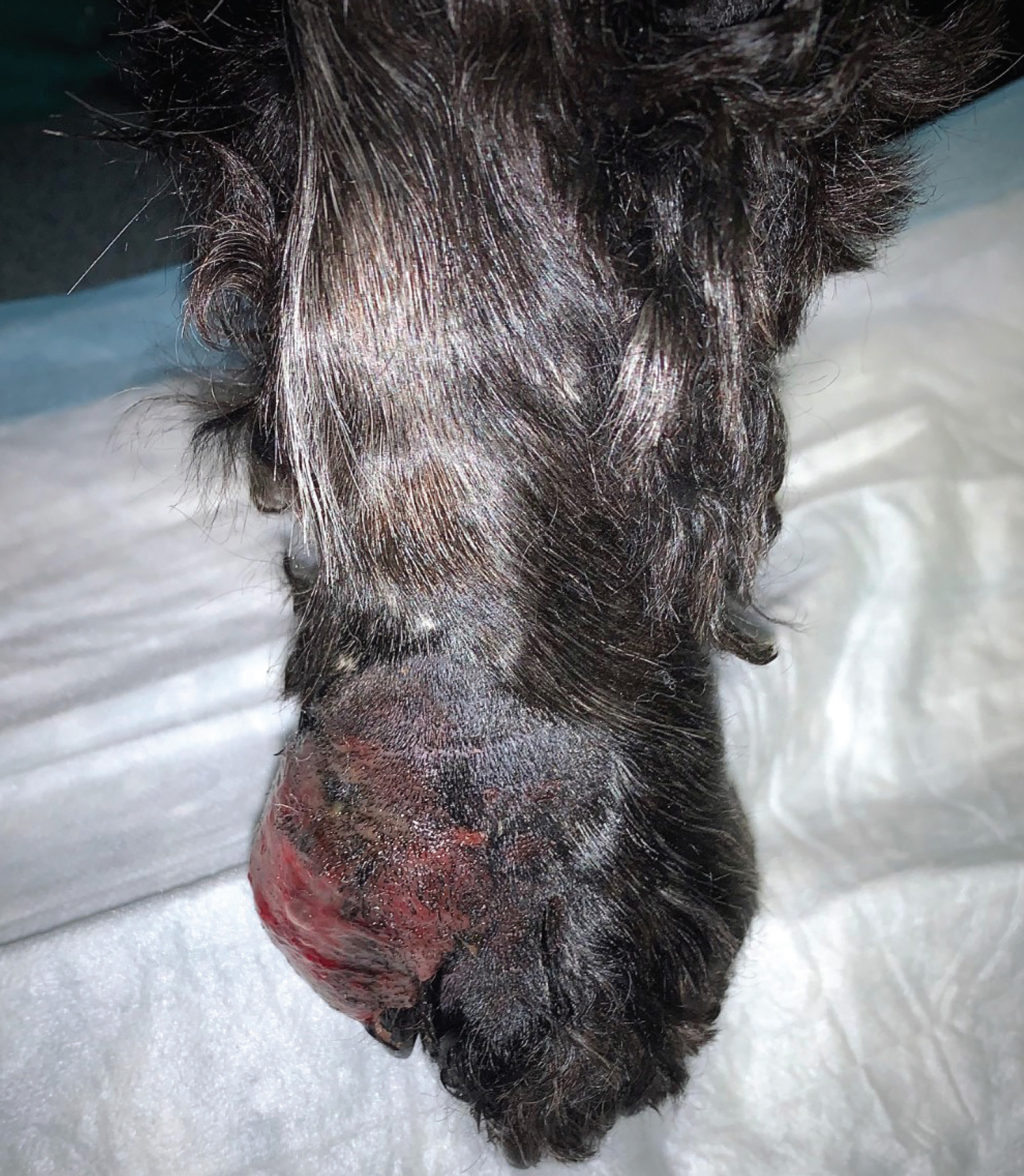 Figure 2. High-grade cutaneous mast cell tumour on the digit of a dog, with marked peritumoral oedema and ulceration.