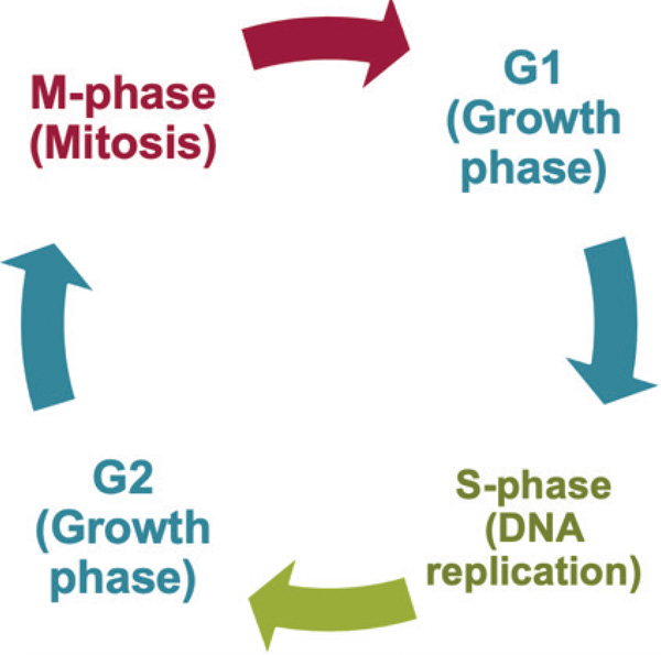 An understanding of the cell cycle is important when considering how various chemotherapy agents work. The cell cycle is divided into four main stages (Figure 1): G1 (growth) phase is where cell contents (excluding chromosomes) are duplicated; S-phase is where DNA replication occurs; G2 (growth) phase is where replicated DNA is checked; and finally, mitosis takes place in M-phase.