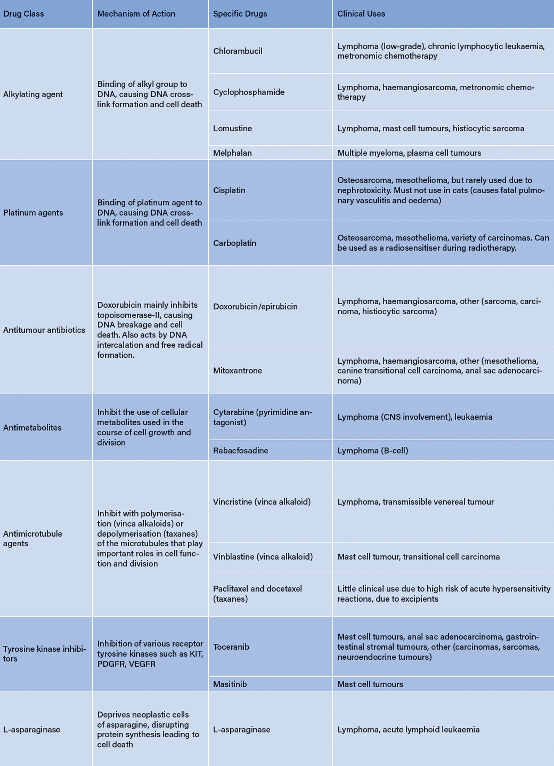 Chemotherapy is a major treatment modality in veterinary oncology either used as sole treatment, for conditions such as lymphoma, or in the adjuvant setting for many other tumour types. There are a variety of chemotherapeutic classes each with specific mechanisms of action and clinical uses. Understanding the differences between each drug, their indications for use, and knowing possible adverse effects and their management is essential to help select the most appropriate treatment course for an individual patient.