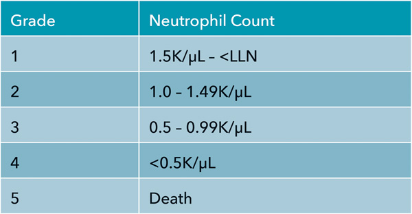 Table 2: The grading system for recording neutropenia, according to the Veterinary Cooperative Oncology Group Common Terminology Criteria for Adverse Events (VCOG CTCAE). LLN = lower limit of normal.