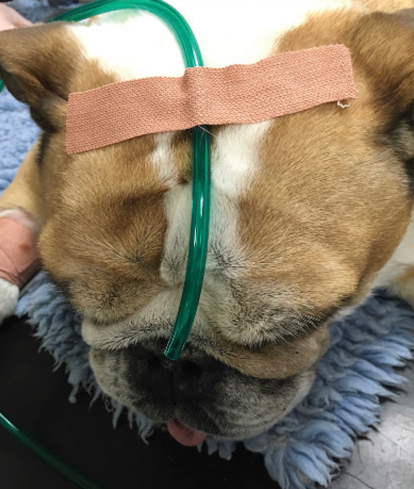Flow by oxygen is simple and easy to administer causing minimal stress. An oxygen flow rate of 2-3L/min usually provides about 25-30 per cent FiO2 if the oxygen tubing is located within 2cm of the animal’s nose. The temptation when delivering flow by oxygen is to increase the flow rates to achieve higher oxygen concentrations, however flow rates greater than 2L/min are generally poorly tolerated. Nasal prongs can increase the FiO2 achieved and can be placed in the emergency setting with minimal stress but they are less effective if the patient is mouth breathing and can be easily removed by the patient.