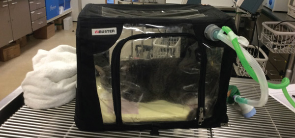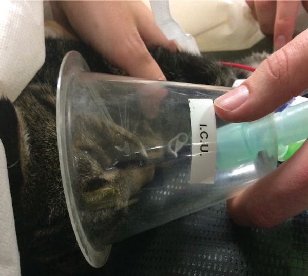 Whilst there are a number of methods of oxygen supplementation, it is essential the method selected is well-tolerated by the patient to minimise stress. Non-invasive means of oxygen supplementation such as flow by oxygen, nasal prongs and use of a face mask are preferred during the initial setting and oxygen cages or tents are the preferred method for providing longer-term oxygen therapy, particularly in cats as they have the added advantage of minimising the stress handling (See Figures 1a, 1b, 1c, and 1d).