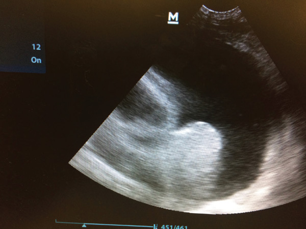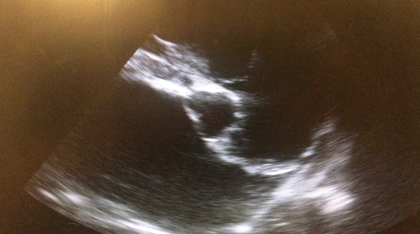 Point-of-care ultrasound is a tool to be used alongside the physical examination in the initial assessment of the dyspnoeic patient. No clipping is required, instead parting the fur and application of spirit to the skin should provide adequate contact for the probe. Placement of the probe in the rib spaces at numerous places dorsally and ventrally in numerous sites on both the left and right hemithorax will allow for assessment of pleural space disease and pulmonary disease. Pleural effusion and pericardial effusions can be identified easily as largely anechoic areas (Figure 3a). However, exudates may appear to be more echogenic. Ultrasound features of lung disease include the presence of ‘B lines’ or 'comet tails’ obliterating the normal ultrasound-gas interference (Figures 3b and 3c) With practice, cardiac chambers and the presence of a ‘glide sign’ can also be assessed on point-of-care ultrasound. Placement of the probe vertically between the ribs on the right hemithorax over the apex heartbeat allows visualisation for the four chamber view and then, with movement of the probe horizontally and cranially, the left atria to aorta ratio can be assessed. This requires practice and care should be taken to ensure correct chambers are identified before attempting a measurement. Increased left atria to aorta ratio suggests cardiac disease as strongly as the case of dyspnoea (Figure 4). A glide sign or ‘sliding lung’ represents the pleural-pulmonary line and in the absence of pleural space disease the lung glides along the thoracic wall as the patient breathes in and out. Absence of this line is suggestive of a pneumothorax.