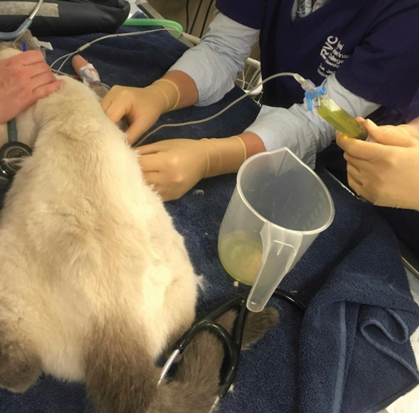 When assessing a patient post-thoracocentesis, it is important to consider other pathologies that are still present that may also be contributing to the patient’s dyspnoea and be sure to manage these. It is particularly important to re-auscultate the chest for better assessment of co-existing pulmonary disease. Pulmonary contusions often are present in cases of traumatic pneumothorax, pulmonary oedema occurs alongside pleural effusion in congestive heart failure and in cases of pyothorax there is often an accompanying pneumonia. All of these will likely require continual oxygen support post-thoracocentesis.