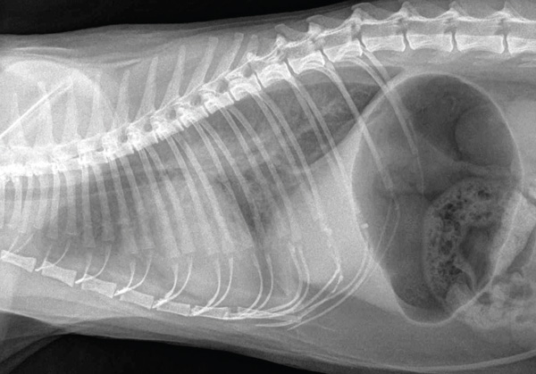 Further diagnostics should only occur when the patient is more stable. Radiography is crucial in assessing a patient with respiratory signs but should only be performed when the patients are more stable and it is possible to get a full three view chest series (dorsoventral, right and left lateral). All three views are required for a complete assessment of respiratory system. Conditions such as aspiration pneumonia may only be seen on a single lateral radiograph. It is important to remember that cardiomegaly is not always apparent on radiographs in cats and, therefore, it is necessary to rely on evidence of pulmonary venous congestion alongside an alveolar pattern to help make a diagnosis of congestive heart failure (Figure 8).