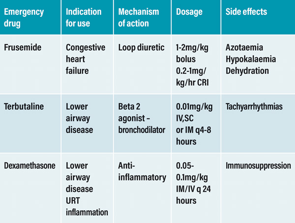 The use of steroids in the emergency setting should be confined to cases of suspected upper airway inflammation or lower airway disease and doses should not exceed anti-inflammatory doses. It is important to be aware that steroid therapy can also worsen a patient in congestive heart failure’s condition. A full list of emergency drugs and doses are available in Table 1.