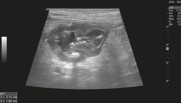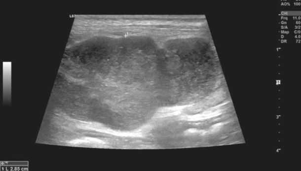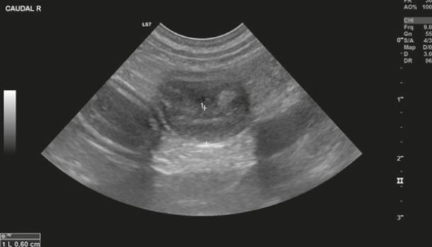Diagnostic imaging forms a crucial part of clinical workup. Abdominal radiography might not be helpful as the changes in the gastrointestinal tract associated with AL depend on the disease severity, but we can observe a loss of detail or mass effect either due to the gastrointestinal mass and/or lymphadenomegaly or, less often, due to free abdominal fluid. Abdominal ultrasound is more commonly used. The most frequent ultrasonographic abnormality observed is abnormal wall layering with or without concurrent increase in wall thickness (Figure 1). The extent of wall changes can be highly variable in dogs with intestinal lymphoma. Where sonographic abnormalities were present, lesions have been characterised as: predominantly hypoechoic, focal or multifocal ulcerations, small hypoechoic nodules to larger masses (Figure 2) and enlarged abdominal lymph nodes (Figure 3). In some cases abdominal effusion may be present as well. The sonographic appearance of gastrointestinal lymphoma is variable and can overlap with that of a normal bowel, especially in cases of small cell or low-grade AL. Lastly, diffuse intestinal thickening has also been reported and it should be differentiated from enteritis. It is important to note that even when no ultrasonographical abnormalities are found, AL cannot be ruled out without obtaining biopsies of the gastrointestinal tract.