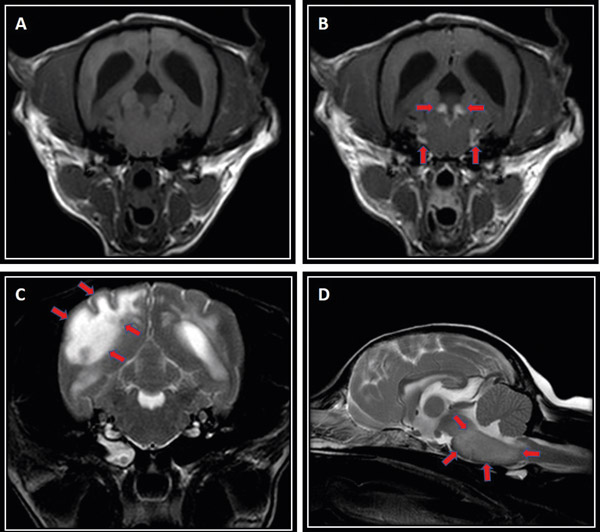 Figure 2: MRI sequences of dogs diagnosed with MUA; T1-weighted transverse image at the level of the pons pre-(A) and post-gadolinium (B) contrast administration. Note the bilateral marked contrast enhancement and thickening of the meninges at this level (red arrows). In another dog with suspected NLE (C), marked asymmetrical T2-weighted hyperintensity is seen on transverse sequence, most predominantly affecting the occipital lobe with loss of white/grey matter distinction (red arrows). The brainstem may also be affected as seen in another dog (D) with diffuse ill-defined T2-weighted hyperintensity and generalised swelling seen on sagittal sequence (red arrows).