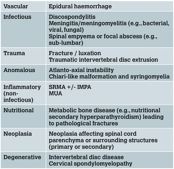 Diagnosis: Haematology and serum biochemistry may reveal a systemic inflammatory response including a neutrophilia, hyperglobulinaemia and hypoalbuminaemia. Acute phase proteins are often elevated including C-reactive protein (CRP) and serum immunoglobulin A. Although non-specific, CRP has also been used as a marker for remission in cases of SRMA. Imaging should be performed to investigate other causes of cervical pain (see Table 1). In patients in which SRMA is highly suspected, radiographs may be sufficient to exclude differentials such as atlanto-axial instability, cervical trauma and discospondylitis prior to CSF sampling. Alternatively, advanced imaging such as CT or MRI may be used. These may often be normal or show meningeal contrast enhancement in cases of SRMA, however would also facilitate exclusion of other differential diagnoses including but not limited to discospondylitis, intervertebral disc extrusion/protrusion, neoplasia, malformation or other meningoencephalomyelitis of unknown aetiology.