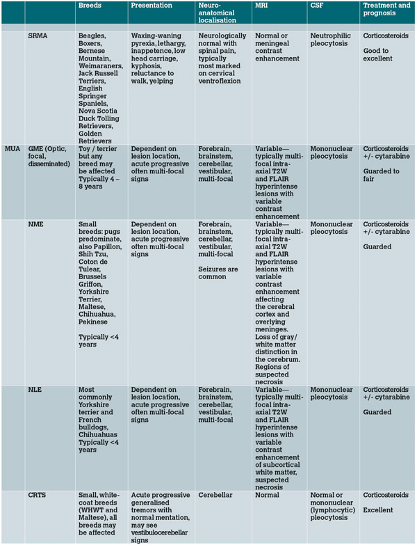 Signalment and clinical presentation differ between disease process and so can help generate a likely list of differential diagnoses. In all inflammatory conditions, neurological signs are typically acute in onset and progressive. Prognosis is variable and dependent on disease process, extent of CNS involvement and response to treatment. Given the suspected immune-mediated aetiology with such conditions, treatment is usually immuno-suppressive doses of corticosteroids, often in combination with a second immuno-modulatory drug.