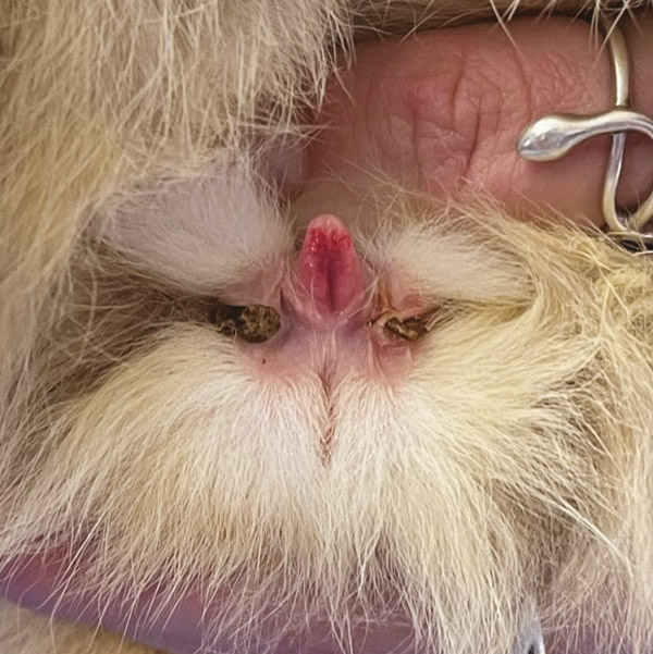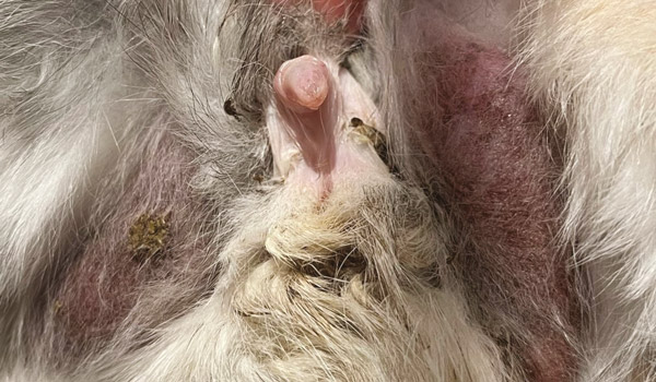 The presence of nipples in male rabbits is variable. The tip of the penis is circular and has been described as a doughnut shape. (Figure 2). In immature males or males that have been castrated early, it can be very easy to over evert the penis, resulting in a slit-like shape. The importance difference is that this ‘slit’ is still contained within the doughnut shape – it does not extend to the perineum. Scrotal sacs are delicate and as the inguinal canals are open, we cannot rely on the presence of testis to sex as they may have been retracted into the abdomen.