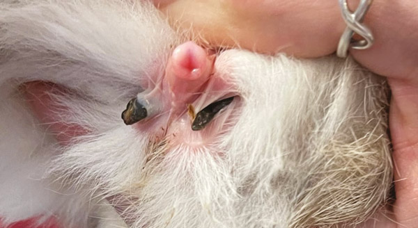 Although many clinicians perform blind intubation in rabbits, this makes me uncomfortable due to the risks of foreign bodies being pushed into the trachea (see Figure 4). I prefer to intubate using direct visualisation of the glottis.
