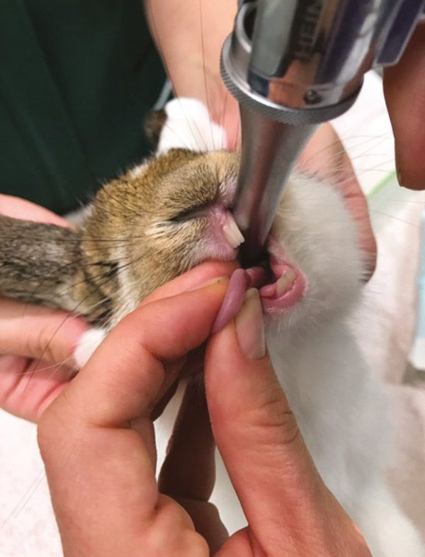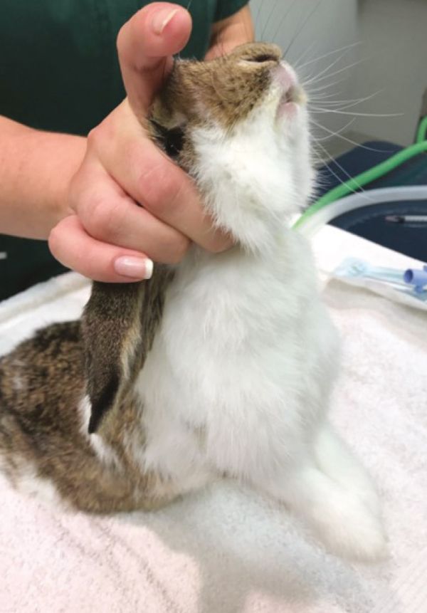 With the rabbit in ventral recumbency, an assistant flexes the head vertically so that the nose of the rabbit is aimed toward the ceiling and lifts the head. The front legs of the rabbit should be dangling just off the table. A long, sterile otoscope cone is introduced into the diastema and directed down the throat. The amount of pressure required (you need to direct the cone vertically and centrally) and the depth of the glottis can make this intimidating. The tongue will sometimes go blue due to venous congestion caused by the scope (see Figure 5).