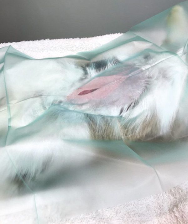 Rabbit skin is delicate and can be traumatised by inappropriate (and sometimes even appropriate) clipper technique. To conserve body temperature, minimise the surgical clip. Only one agent is used for surgical scrub, either chlorhexidine or an iodine-based skin disinfectant, depending on the surgeon’s preference. We do not use a surgical spirit-based spray as during evaporation this causes loss of heat.
