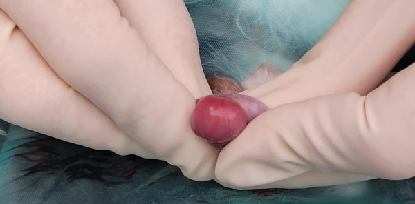 Figure 13: Squeezing either pole of the testicle to pop it through the scrotal sac.