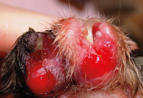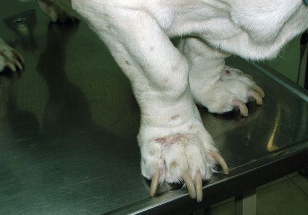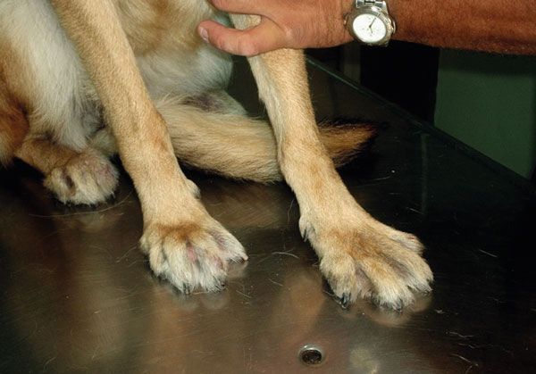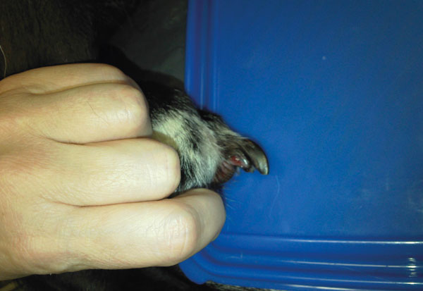 It is wise to muzzle these dogs, regardless of their normal temperament and to first exam all the other nails, rather than the nails on the limb for which the client has presented the dog for lameness.