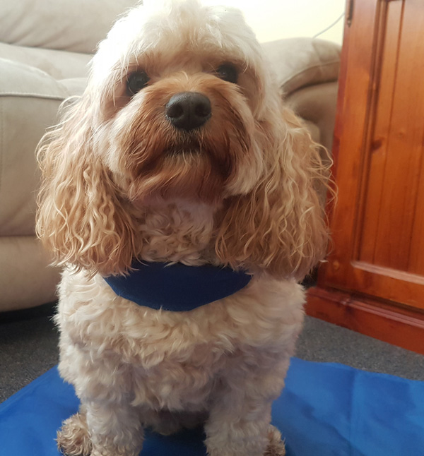 As mentioned above, you can get cooling mats of different types for dogs. I like the Cool Champion blanket as it is lightweight, folds up small and you only need water to activate it, so great to have handy in the car or when travelling.