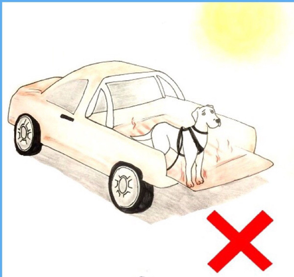 Remember to watch the back of uncovered trucks or tractor trays as another potential burn surface for the dog’s feet.