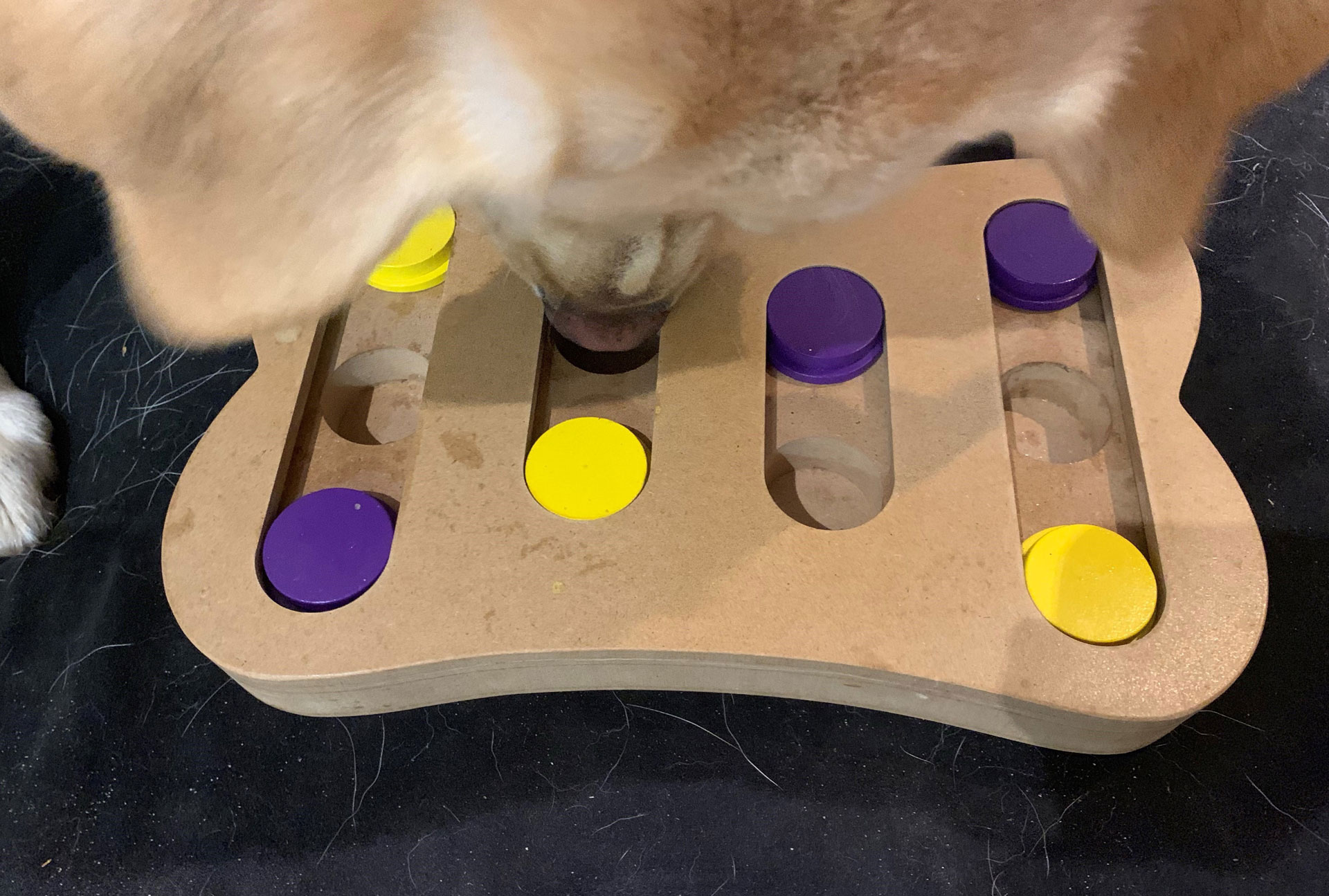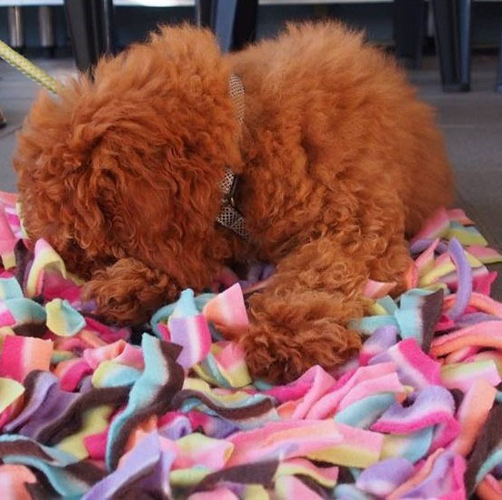 As olfaction is the dominant scent by which dogs perceive their world, it is really important to continue to provide ways for a dog to do a scent hunt at home, i.e., using snuffle mats, treat treasure hunts, etc