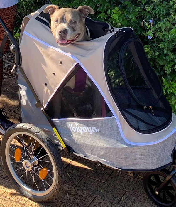 Purpose-built strollers allow old dogs to be taken outdoors and slowly pushed along so they can appreciate the many smells on the walk.