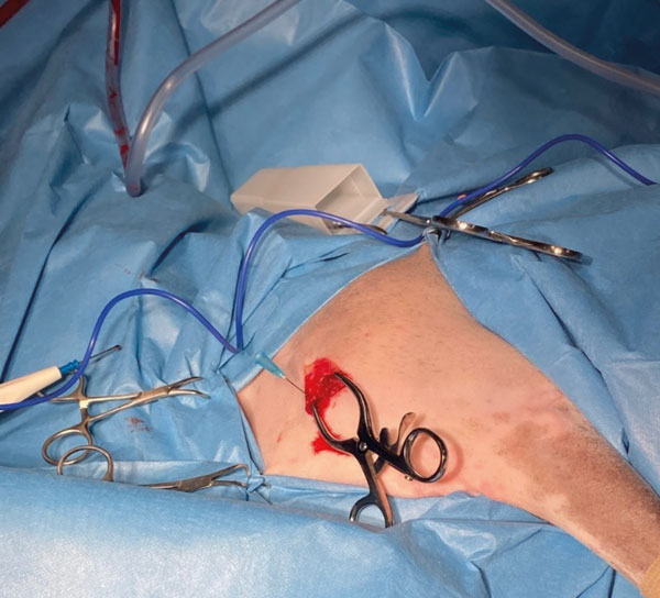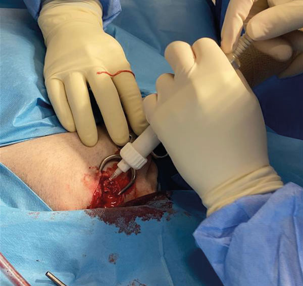 A second bone tunnel was created more proximally to the first entry point, to allow further administration of the cement.