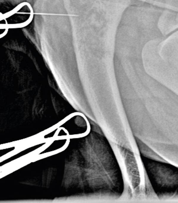 A cranio-lateral approach to the left proximal humerus was performed; an approximately 4cm skin incision was made, and blunt soft tissue dissection allowed exposure of the lateral aspect of the proximal humeral cortex. A 23Gx1 ¼" hypodermic needle was placed in the area of the bone lesion (Figure 2) and x-rays were taken to confirm correct positioning of the needle (Figure 3).