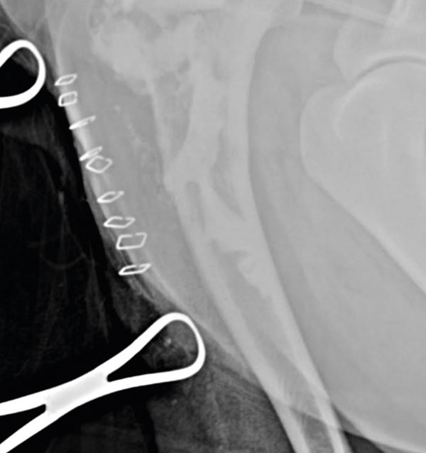Given the owner’s reluctance to opt for an amputation, palliative and limb-salvage techniques were offered. In a study conducted on 17 client-owned dogs, limb salvage surgery for OSA of the proximal humerus was found to give unacceptable outcomes and high post-operative complication rates, with ultimate limb function being poor in 59 per cent of the dogs.8 This anatomical region was also shown to be one of the most common locations for the occurrence of OSA-related pathological fractures, likely because structural bone damage at this site may go unnoticed due to the significant amount of soft tissue coverage compared with other commonly affected areas.14