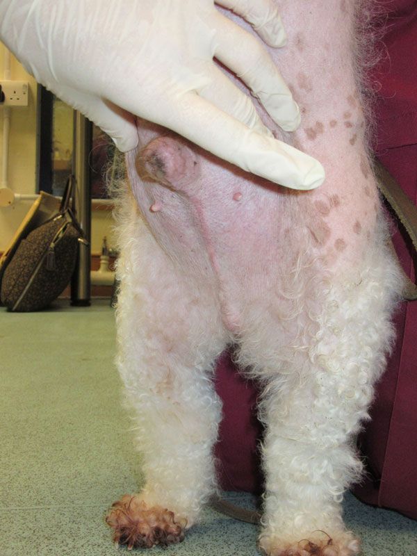 When vets were first presented with these cases, they were perplexed, and either diagnosed ovarian remnant syndrome post desexing, or other endogenous hormone aberrations, or adrenal disease. The dogs would often yelp as if in pain, suggesting internal disease concerns. Desexed male dogs presented with enlarged mammary glands and abnormally small penises. The ventrum skin often had the texture of plastic. Alopecia was also often present. Desexed young female puppies presented to vets with markedly swollen vulvas as if in oestrus.
