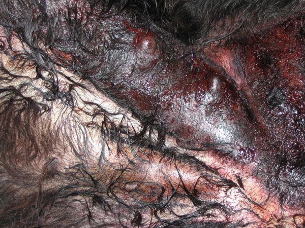 The cat in Figure 10 presented to a colleague some years ago with severe diarrhoea and prolapse of a small amount of rectal mucosa. She initially responded well to treatment but developed extensive necrotising dermatitis, assumed to be secondary to gastrointestinal flora invasion across the damaged rectal mucous membranes and into the perineal tissues. In a non-specific history case, fever plus pain disproportionate to the appearance of the affected area should alert vets to the possibility that this is not your average cat abscess in the perianal, perineal and scrotal area.