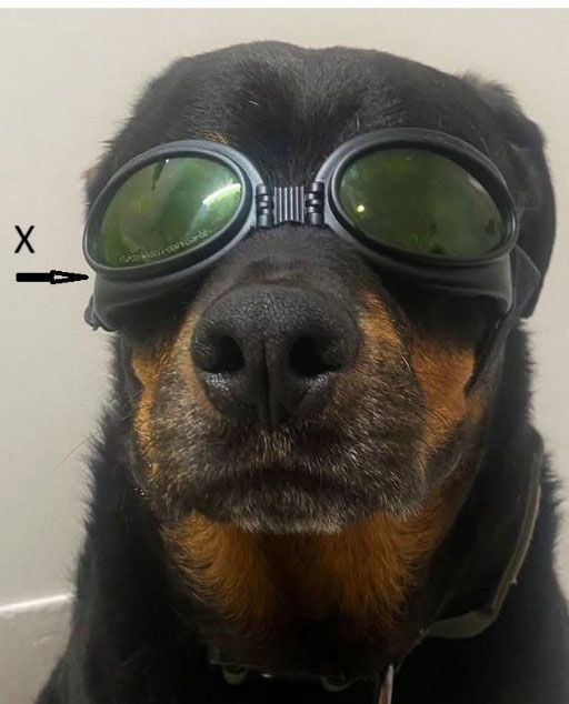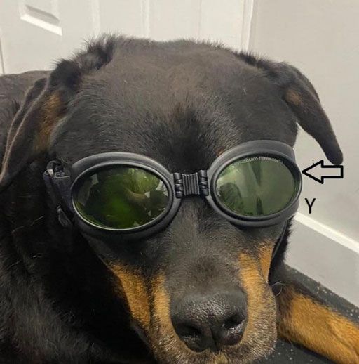 All laser glasses will have the safety numbers printed on the top edge of the glass lens. This is a handy way to know how to put the safety glasses on the correct way up on the pet (see Figures 1 and 2).