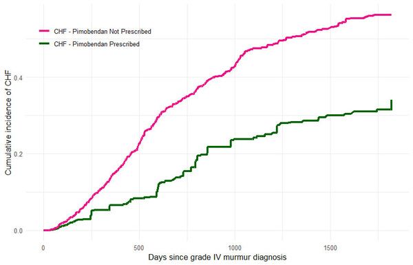- risk of CHF at five years was 34.1 per cent in dogs prescribed pimobendan, compared to 56.3 per cent in dogs not prescribed pimobendan (Figure 2);