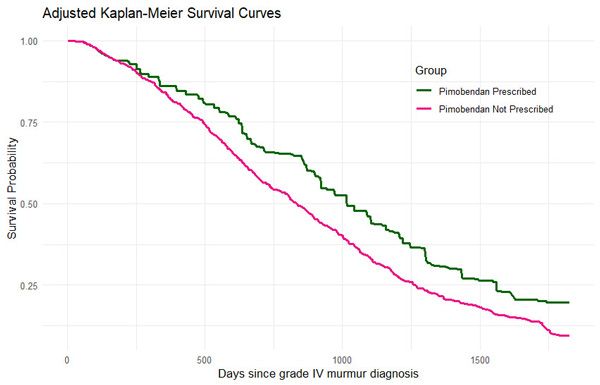 Figure 3: Survival curves (after bias adjustments), over a maximum five-year follow-up period, for all-cause mortality in dogs attending primary-care practices in the UK prescribed pimobendan and dogs not prescribed pimobendan within six months of first grade IV/VI heart murmur diagnosis.
