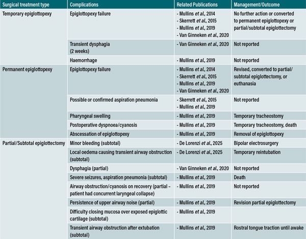 Table 2: Complications and outcomes associated with different surgical treatment options described for management of epiglottic retroversion in dogs.