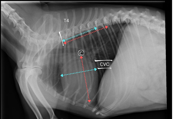 Figure 3: VLAS. Lateral thoracic radiograph with carina (c), caudal vena cava (CVC), and spinous process of the fourth thoracic vertebra (T4) identified. Distance is measured from the carina to the dorsal border of the caudal vena cava at the site where it intersects the caudal aspect of the cardiac silhouette (red line). This measurement is expressed in terms of vertebral body units using the cranial border of the fourth thoracic vertebra as the starting point.