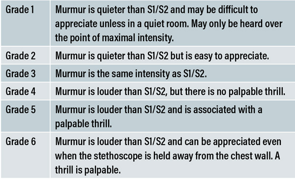 2. WHAT GRADE IS A HEART MURMUR WHEN THE INTENSITY OF THE SOUND OF THE HEART MURMUR IS THE SAME INTENSITY AS S1/S2 HEART SOUNDS?