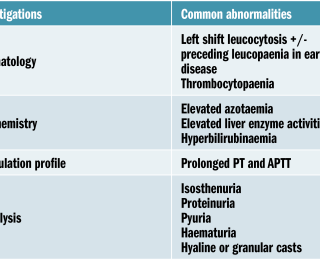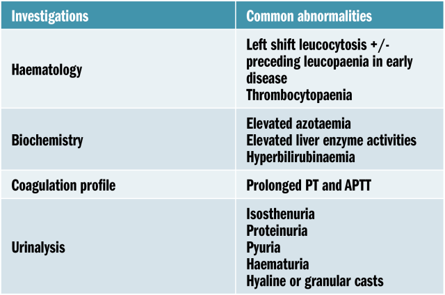 Laboratory tests will often reveal a range of non-specific abnormalities which might raise suspicion of leptospirosis and prompt confirmatory diagnosis. The most common abnormalities are listed in Table 4 below.