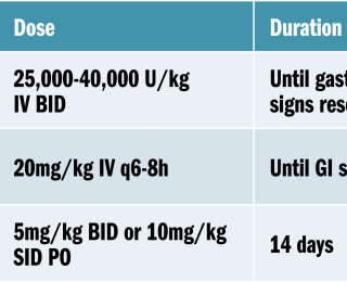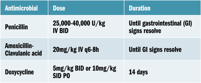 The most common antimicrobials used are penicillin derivatives and doxycycline. The dosages are listed in Table 7. Penicillin and penicillin-related antimicrobials are useful for treating the leptospiraemia but will not prevent leptospires colonising renal tubules. The use of doxycycline is required to eliminate persistent renal carriage. However, doxycycline is indicated only once the patient is eating and not vomiting, so more critically ill patients should begin therapy on intravenous penicillin.