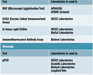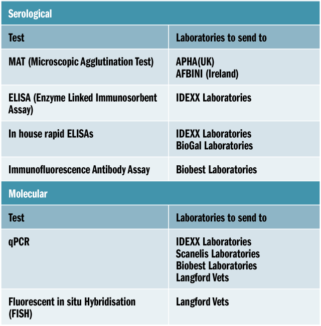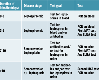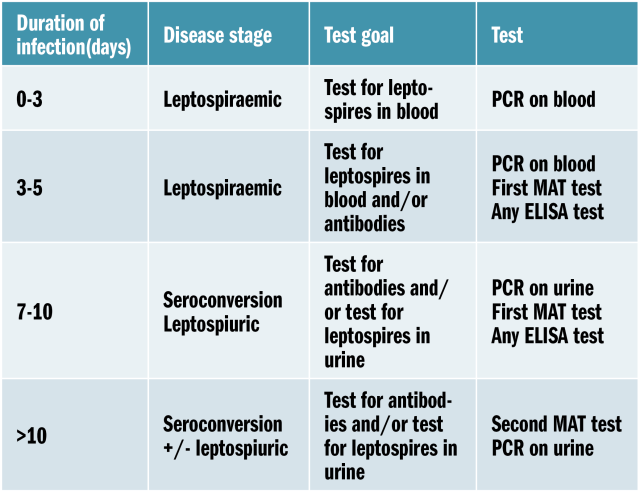 In order to confirm the diagnosis of leptospirosis, specific tests must be performed on blood or urine samples. There are numerous tests available and knowing when to use them is crucial to diagnosis. Tests are divided broadly into two categories: