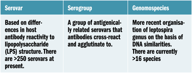 Understanding leptospirosis is complex as there is an ever-changing nomenclature of the bacteria, the key terms are defined in Table 2 below. The evolving classifications and grouping provide challenges for clinicians.
