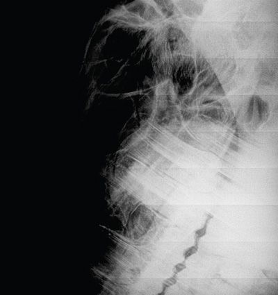 Figure 2. Mediolateral view of the shoulder (CR image): The radiograph of the shoulder is overexposed with poor positioning ( second shoulder superimposing) and inadequate collimation. The high exposure and large area in the primary beam have resulted in the generation of a lot of backscatter which PSP plates are very sensitive to, resulting in an image that is overly dark and grey with poor contrast.