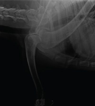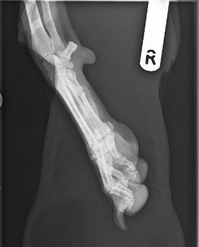 Figure 3. Mediolateral view of the right carpus and pes (CR image): a silhouette of the previous image – a DV thorax and cranial abdomen is visible with distal right forelimb superimposed. This is due to inadequate erasure of the PSP plate and residual ghosting of the thoracic image remains.