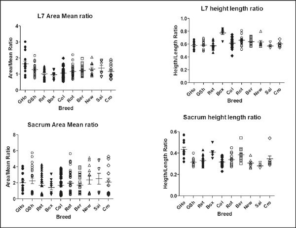From this work, two biometric parameters were devised for both L7 and the Sacrum: Area-Mean Ratio (AMR) and Height-Length Ratio (HLR). The AMR is a measure of the relative bone density, while the HLR signifies the available surface area on the bone for a given unit length. Both parameters are inversely proportional to the characteristic that they represent – the lower the AMR, the higher the bone density, and the lower the HLR, the more rectangular the bone. Although the dogs in the study varied in terms of age, weight and sex, this was normalised during data analysis to make the parameters independent of any demographics. We concluded that significant differences in both anatomy and bone density occurred between the different groups of dogs (Cross breeds, large breeds, giant breeds1, Figure 1).