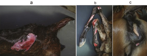 Figure 1: Skin defects on the head (left), front legs (centre) and ventral to the vulva (right) in a foal affected by FFS. Images courtesy of Dr. Christine Aurich.