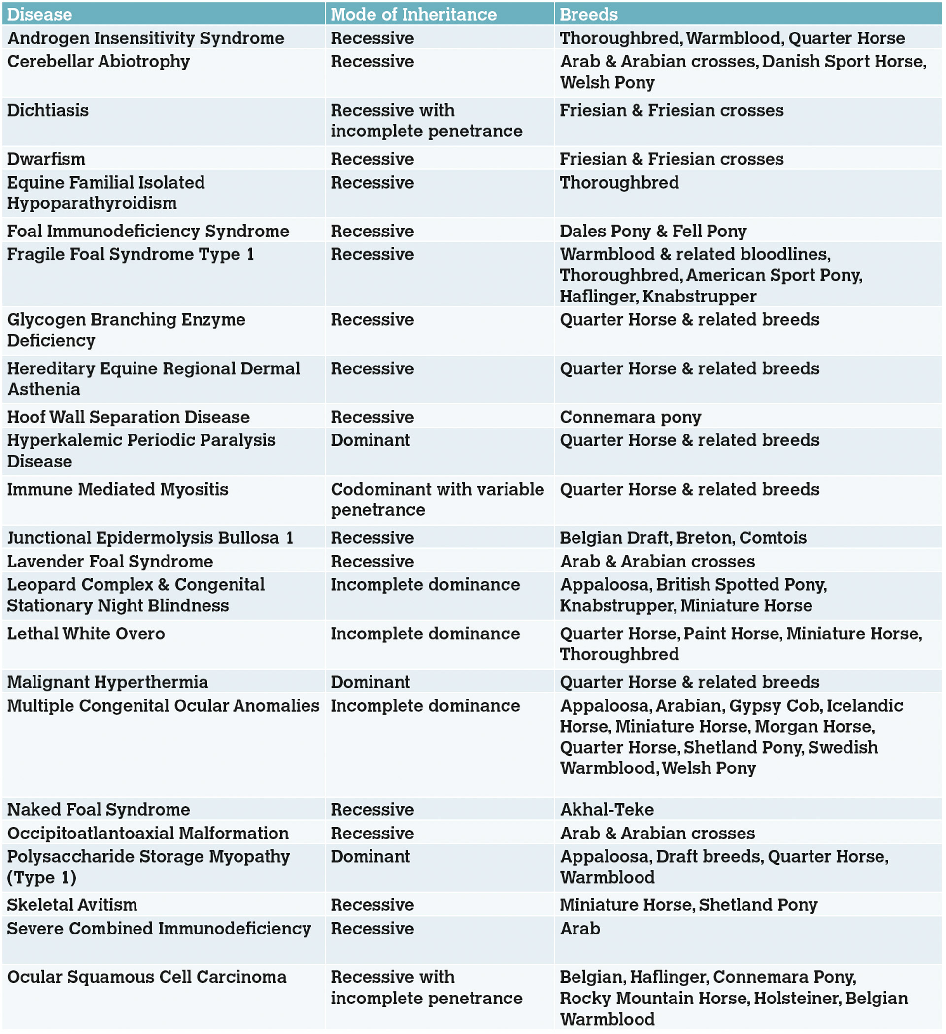 Table 1: Equine genetic diseases for which genetic tests are currently available.